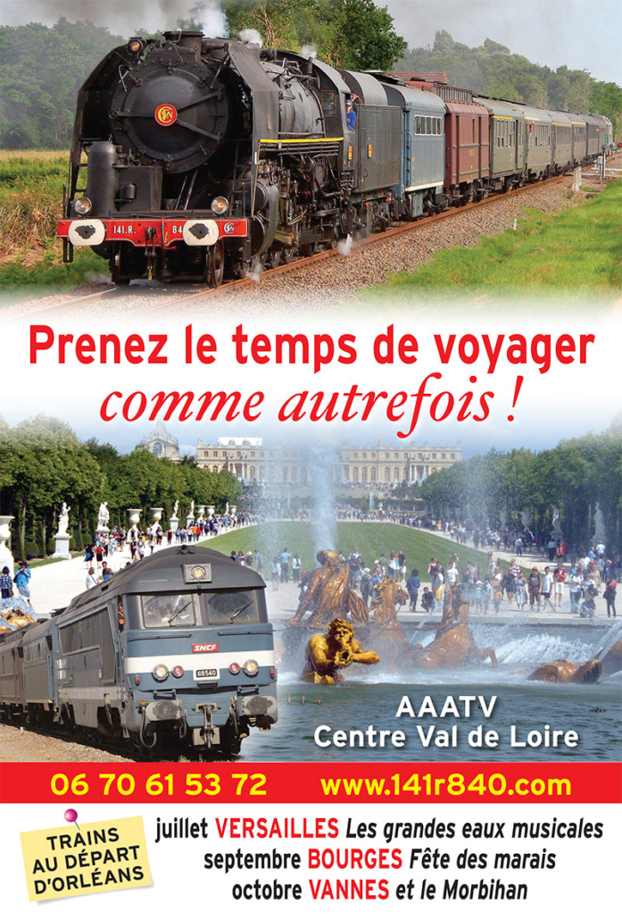 En gare d’Orléans, de 9h à 18h, l’AAATV-CVL participera aux côtés de la SNCF à une exposition de matériels ferroviaires. Elle présentera sa locomotive à vapeur 141R840 sur laquelle d’importants travaux sont actuellement en cours ; nos bénévoles feront visiter cette locomotive et expliqueront les différents chantiers qui ont été menés par l’association ces dernières années.